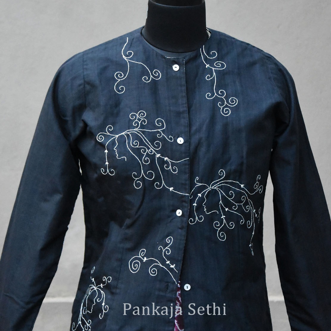 Crafted for elegance, this black coloured silk long jacket is exquisitely hand-rendered with back stitch embroidery in a delicate face of women’s face design. The base fabric combines fine mulberry silk with twisted cotton, handwoven in Odisha, Eastern India—a blend that merges luxurious texture with subtle strength.