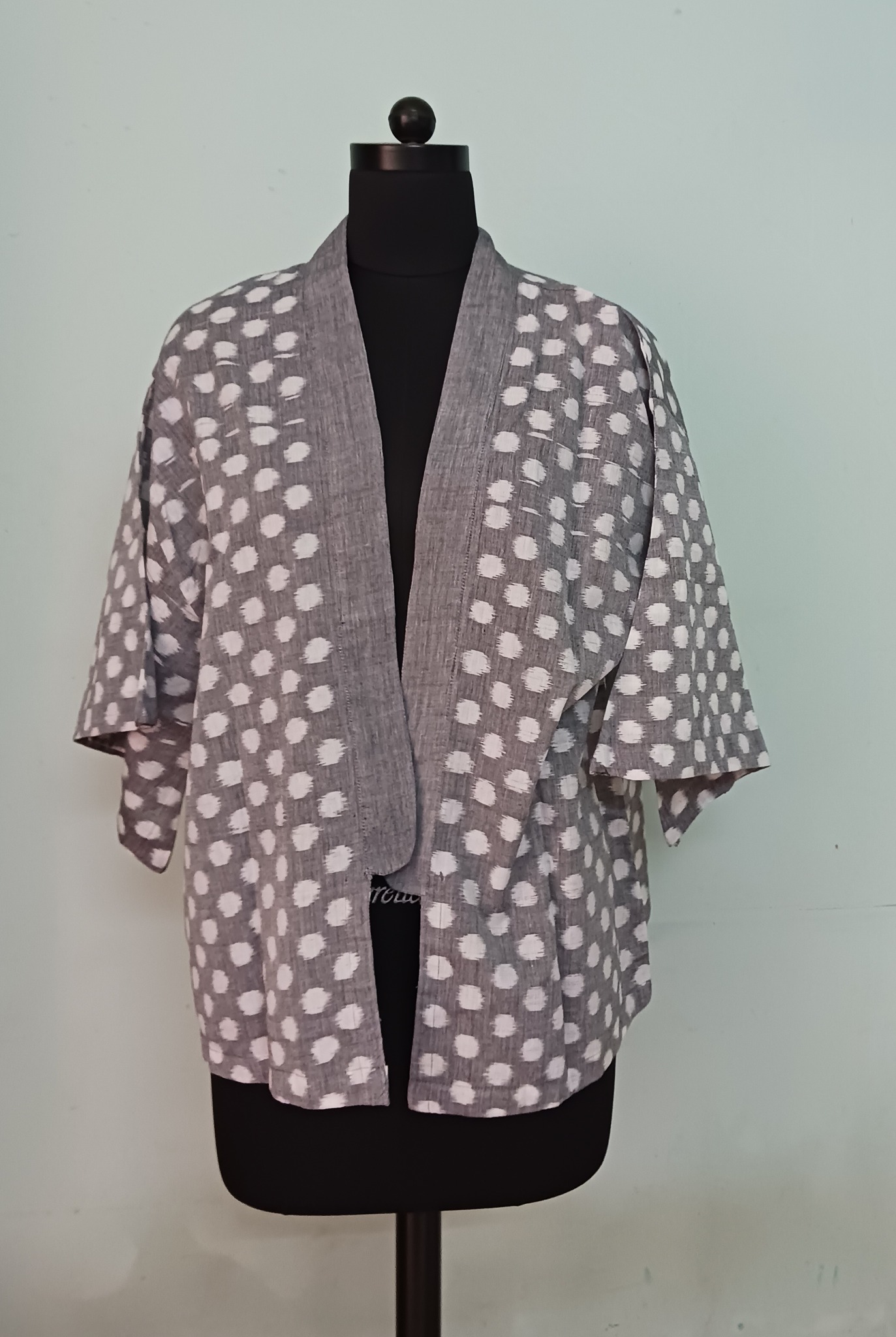 Crafted for ease and comfort, this grey coloured cotton kimono shrug is exquisitely made using single ikat weft resist tie-dye delicate polka design. The base fabric combines twisted cotton, handwoven in Odisha, Eastern India—a blend that merges luxurious texture with subtle strength.