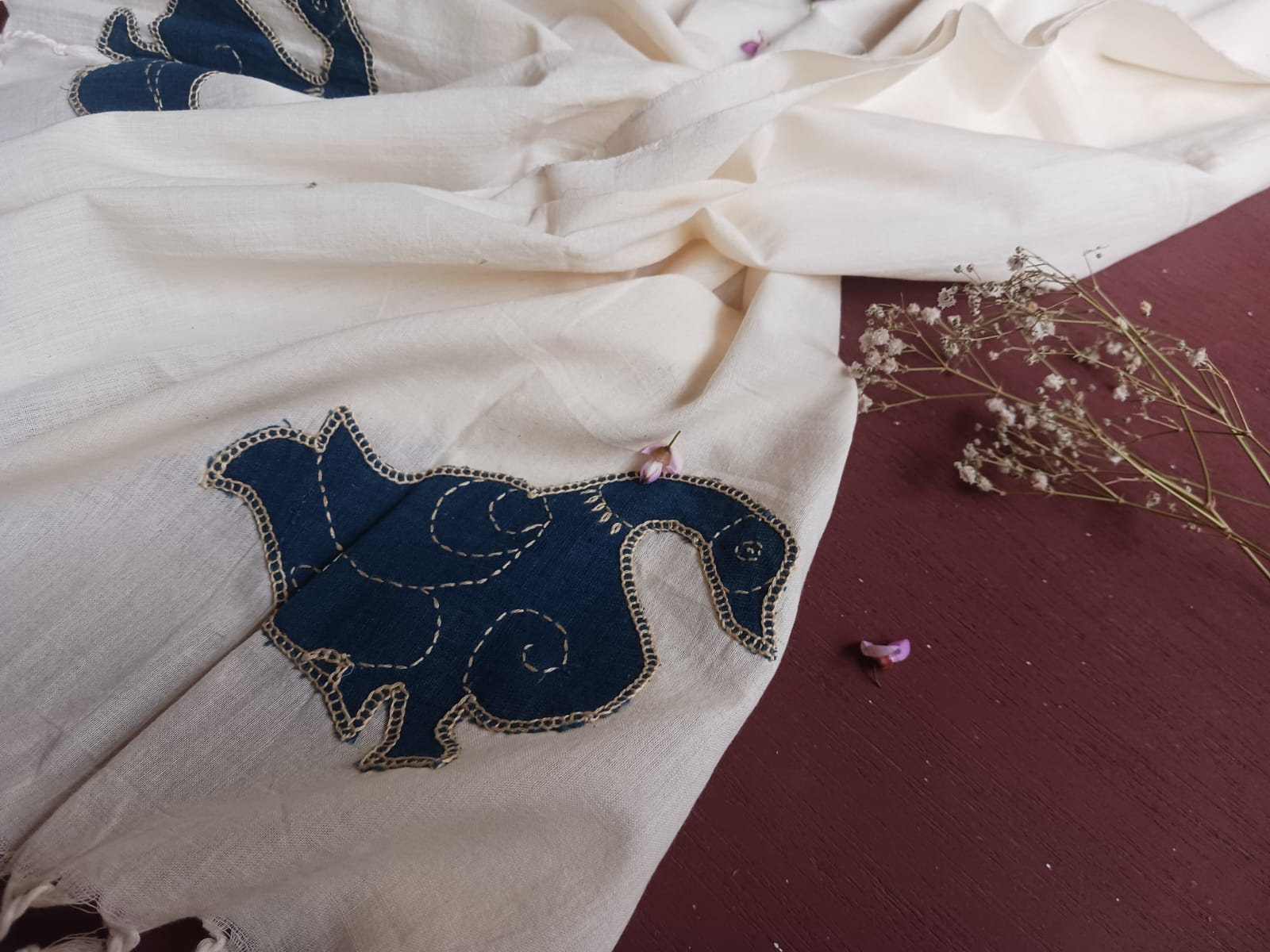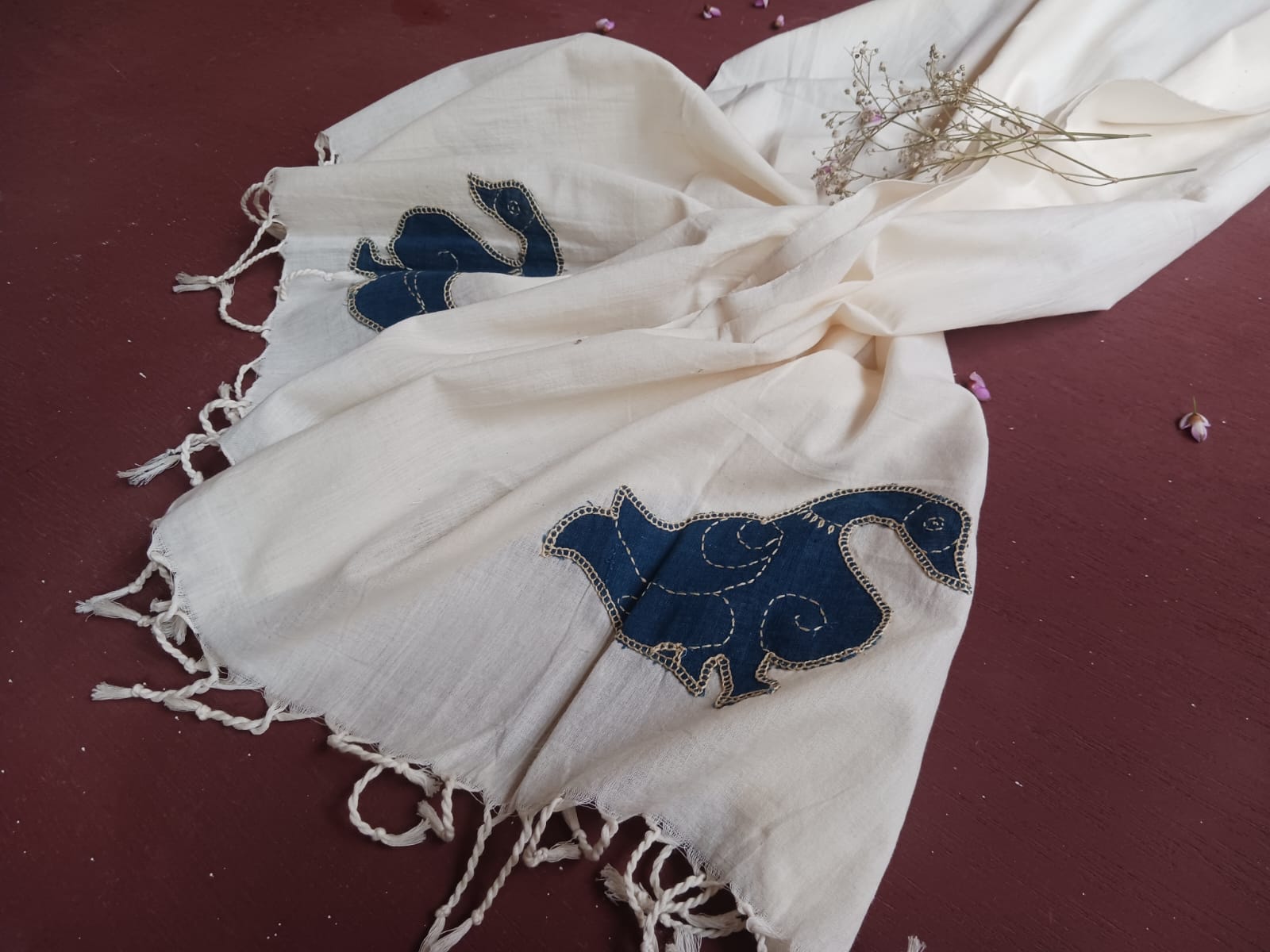 White organic cotton-hand embroidered Odisha appliqué craft stole 14-Pankaja Sethi