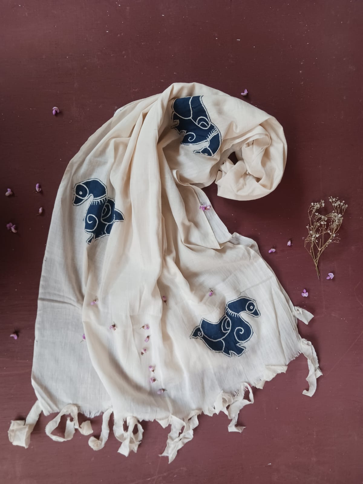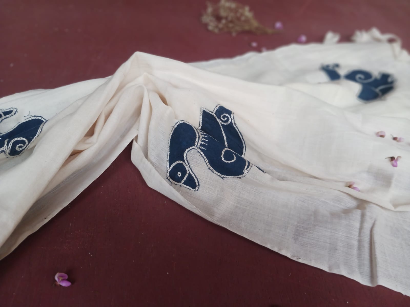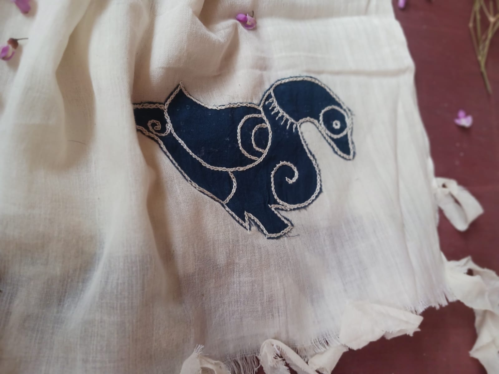 White organic cotton-hand embroidered Odisha appliqué craft stole 06-Pankaja Sethi