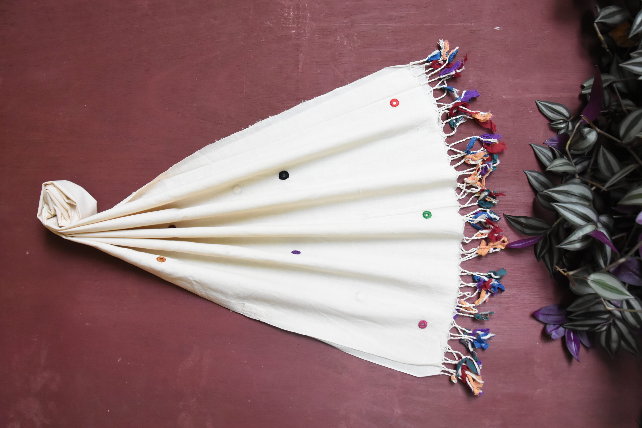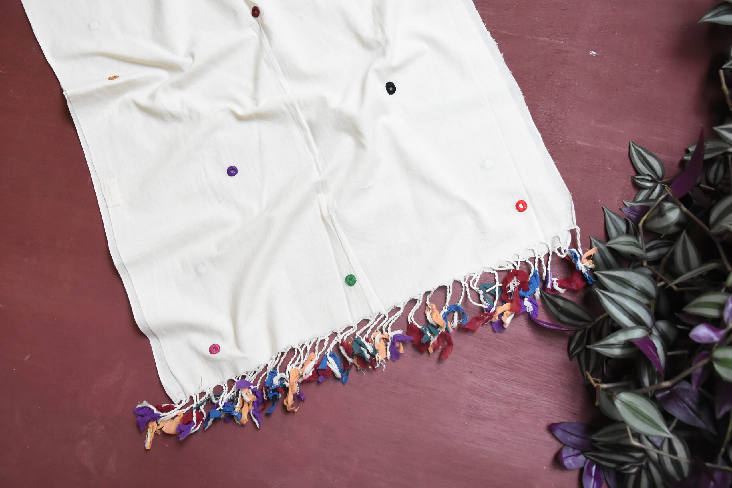 Wrap yourself in a soft white organic cotton stole, hand-embroidered with mirror work used in Odisha appliqué craft stitch made by the women artisans of Pankaja Sethi Studio, celebrating slow and sustainable textiles. The base cloth is made with cotton in Odisha, located in Eastern India. This is an innovative design with aesthetic blend of materials. This contemporary motif is inspired from textures of nature using hand embroidery tradition. Pankaja Sethi textiles resonates craftsmanship and solidarity with craft community.